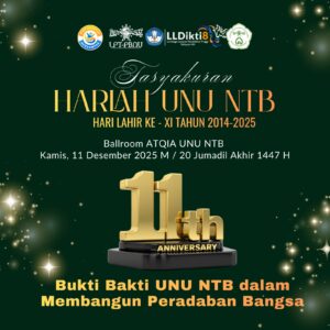Mataram — Universitas Nahdlatul Ulama (UNU) Nusa Tenggara Barat menggelar Tasyakuran Harlah ke-11 dengan penuh haru, hangat, dan refleksi sejarah pada Kamis, (11/12) di Ballroom Atqia UNU NTB. Kisah itu diceritakan oleh Prof. Dr. H. Fathul Anam, M.Si, Ketua Forum Rektor LPTNU sekaligus Rektor UNU Sidoarjo (UNUSIDA) yang mengenang kembali sejarah perjalanan awal pendirian UNU NTB, tentang bagaimana beliau mendampingi almaghfurlah TGH. Ahmad Taqiuddin Manshur, sang pendiri UNU NTB di bulan September 2014. Pada masa itu, setelah izin operasional UNUSIDA turun, PBNU mengamanahkan dirinya untuk mendampingi pendirian 3 UNU lainnya yaitu UNU NTB, UNU Blitar, dan UNU Sunan Giri.
